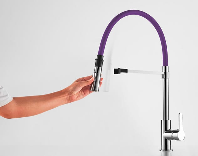 En su la parte final dispone de mango extraible que nos da una total movilidad para llegar a cualquier zona del fregadero, además dispone de un práctico botón en el mangoque al presionarse da un chorro efecto lluvia.