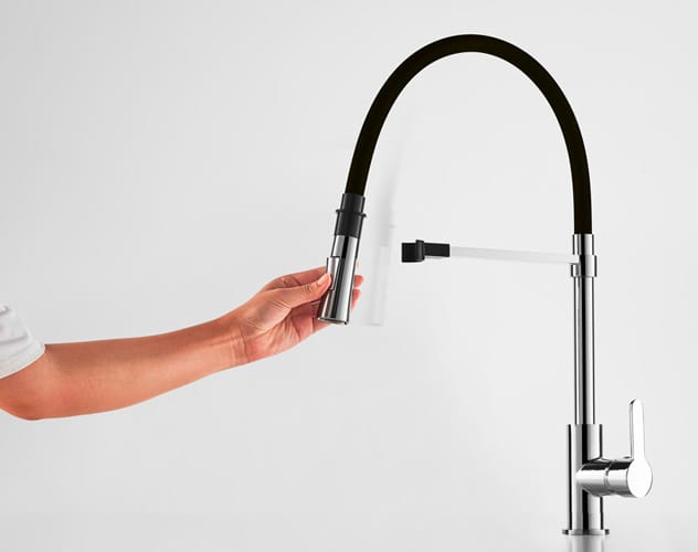 En su la parte final dispone de mango extraible que nos da una total movilidad para llegar a cualquier zona del fregadero, además dispone de un práctico botón en el mangoque al presionarse da un chorro efecto lluvia.