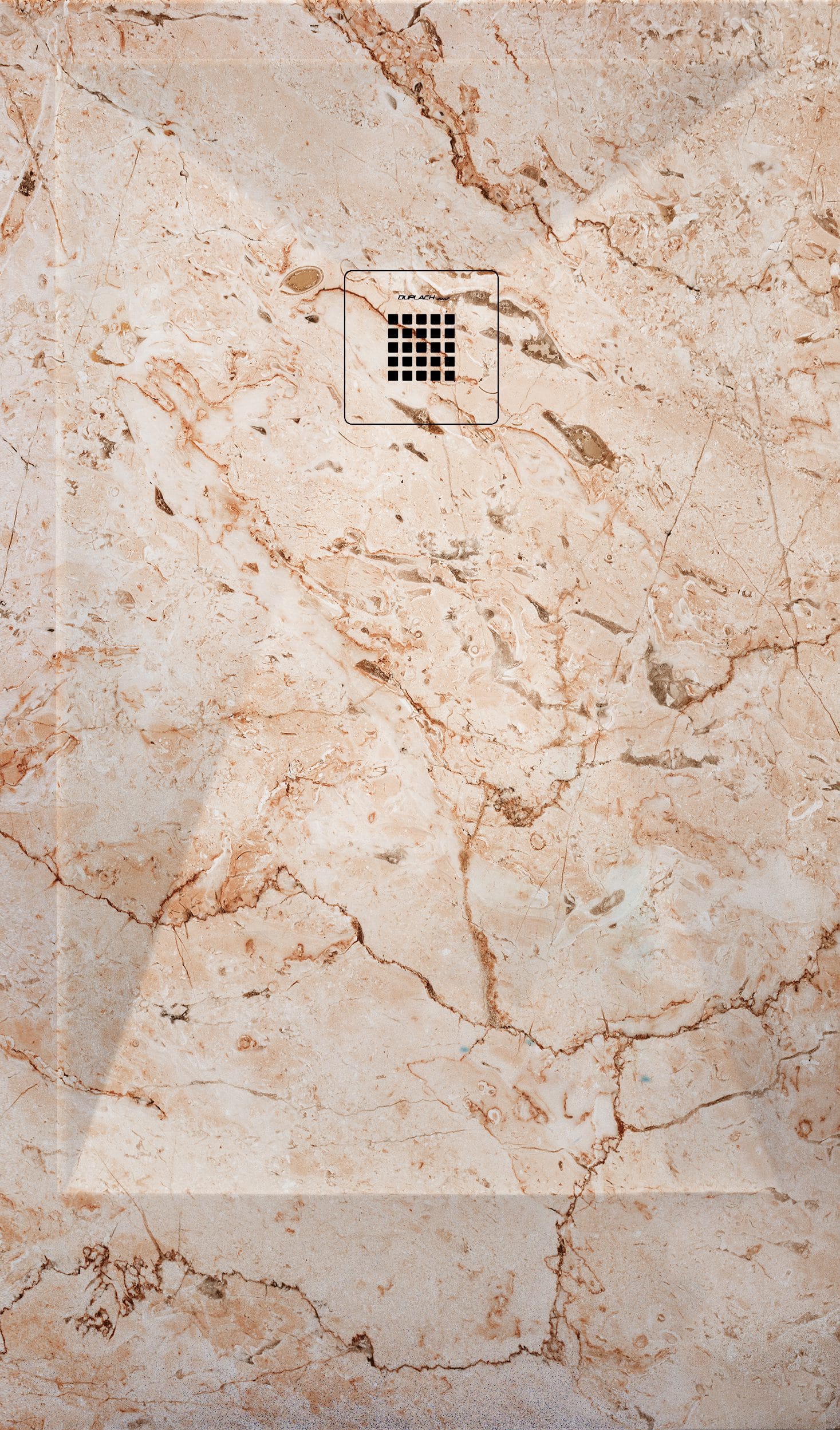 Descubre todos nuestros modelos de plato de ducha con textura de mármol con su rejilla cuadrada mimetizada con el plato.