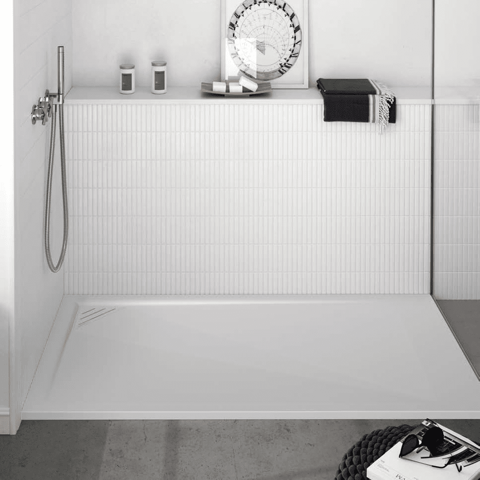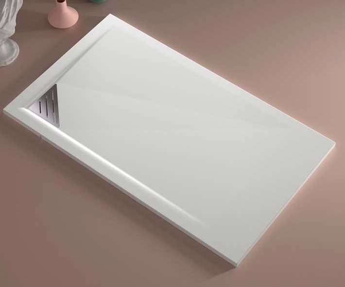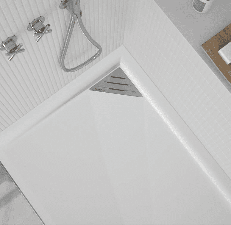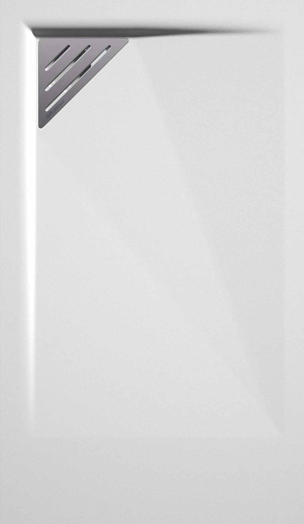 Plato de ducha carga mineral STONE MIO con rejilla en esquina.