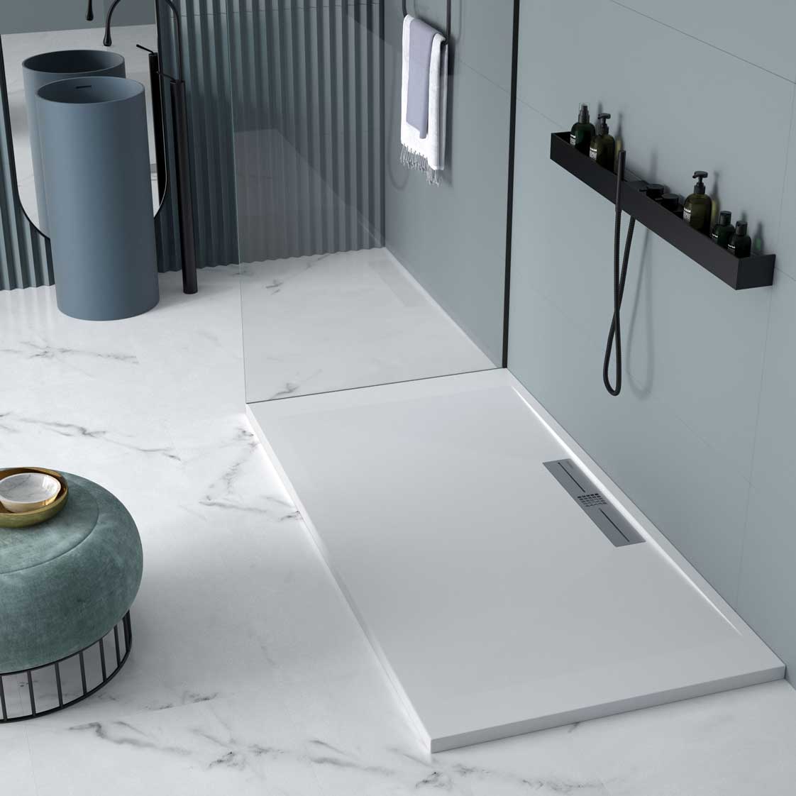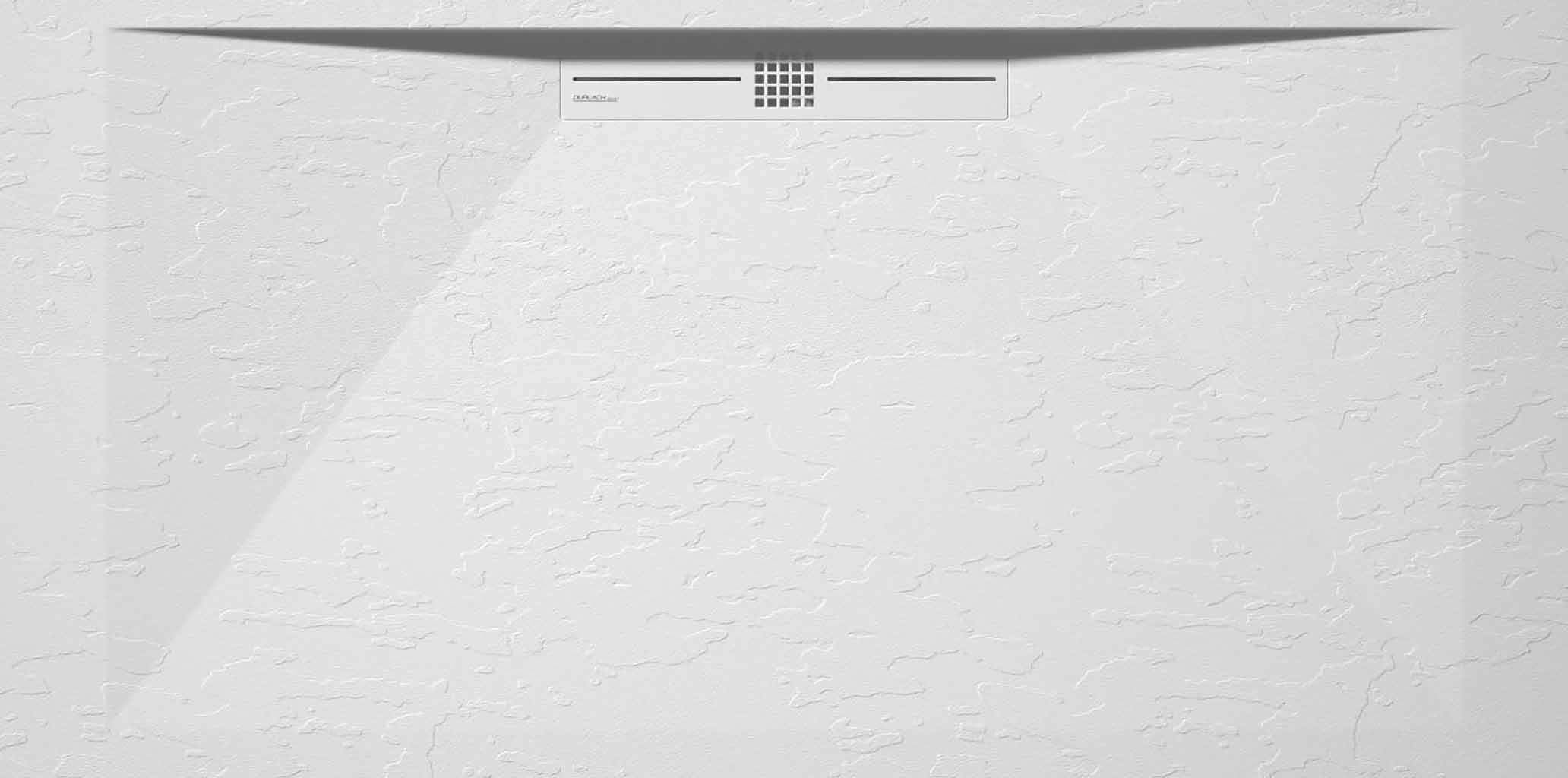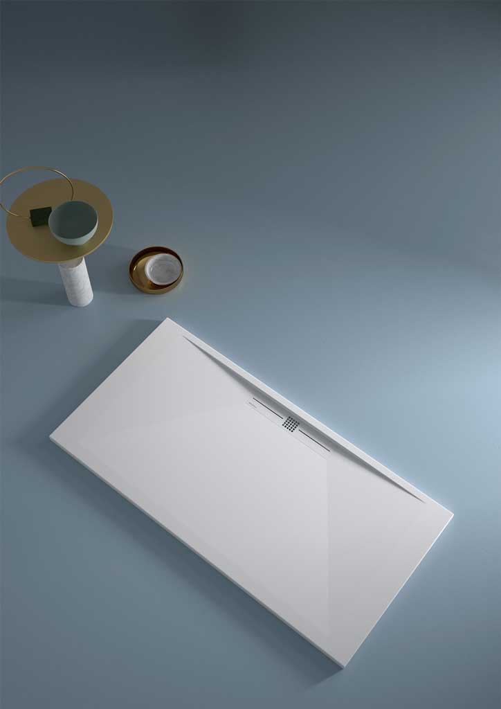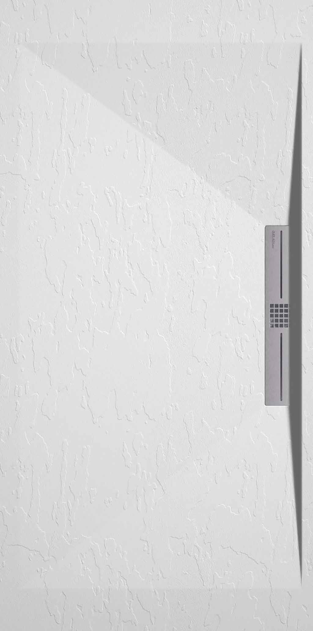 Plato de ducha carga mineral STONE SIDE con pendiente centrada y rejilla rectangular.
