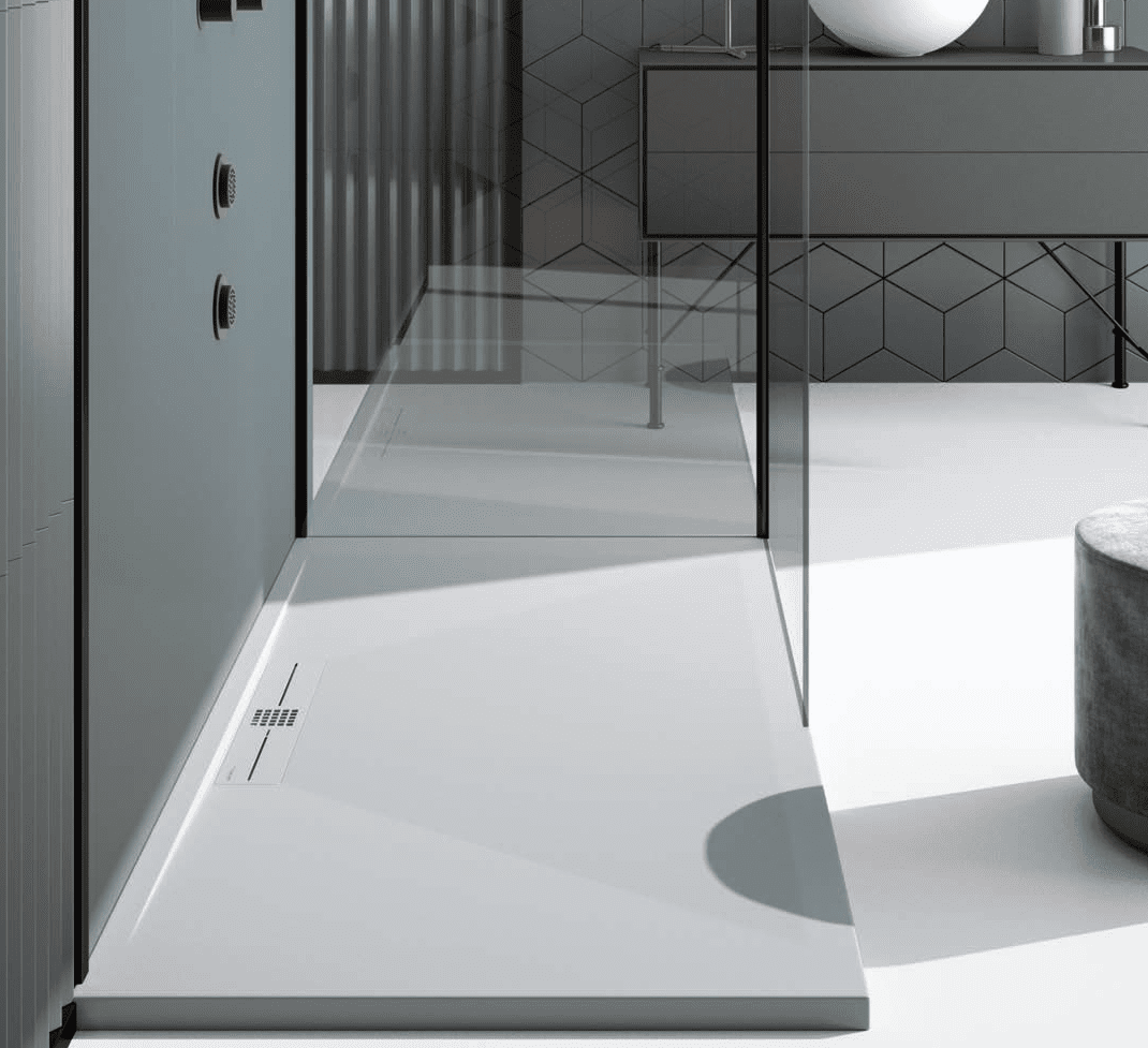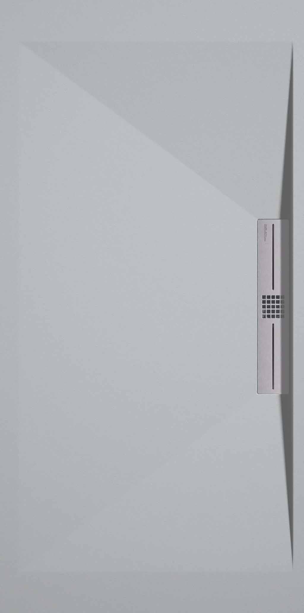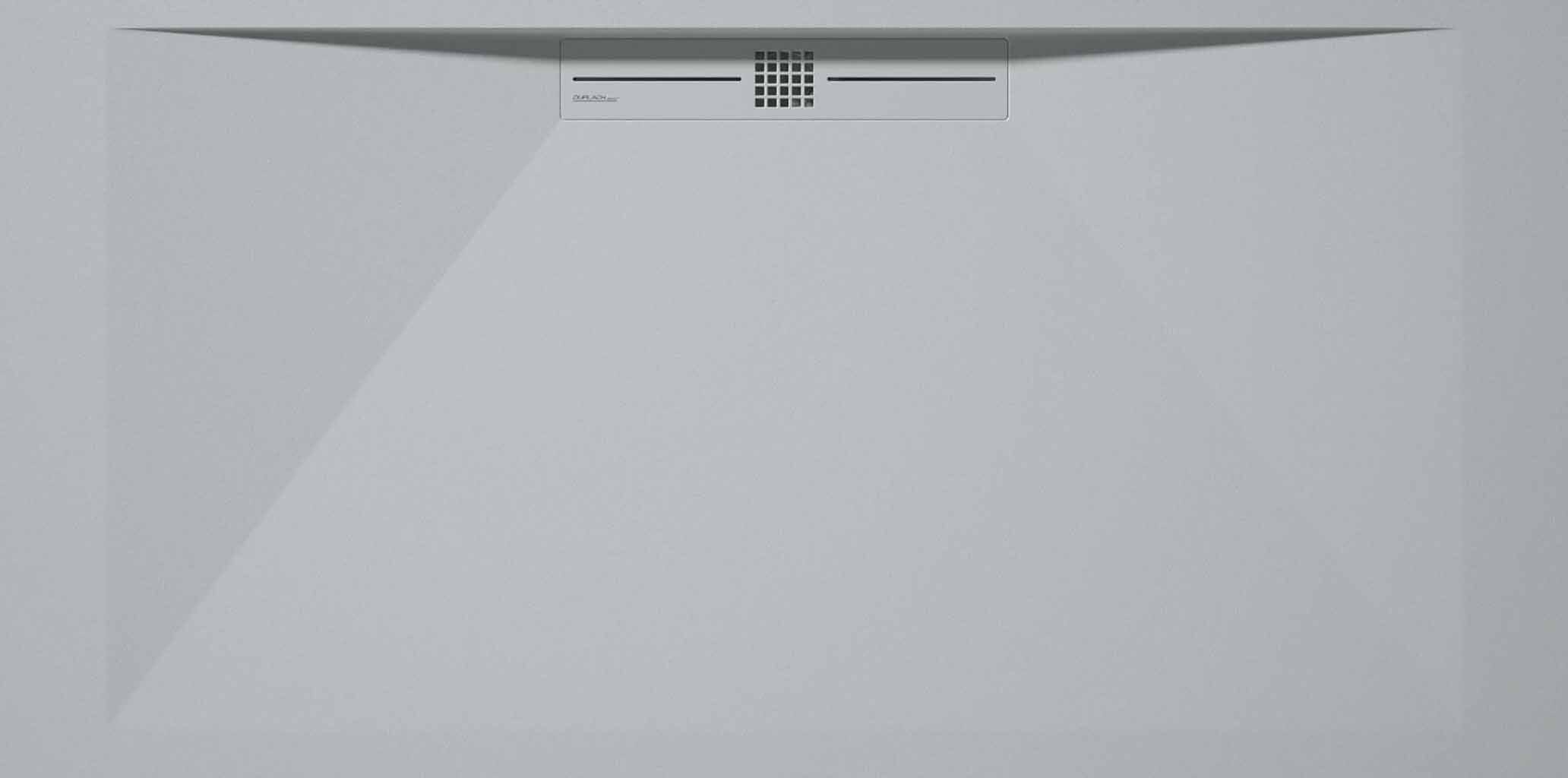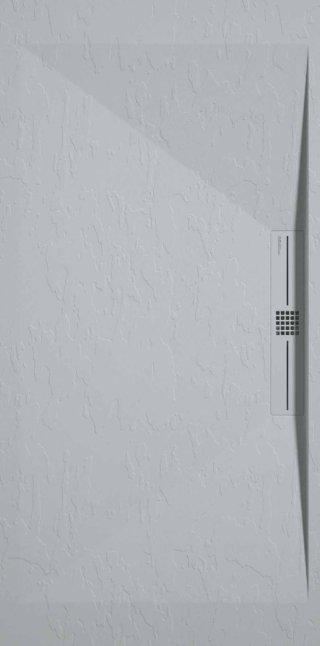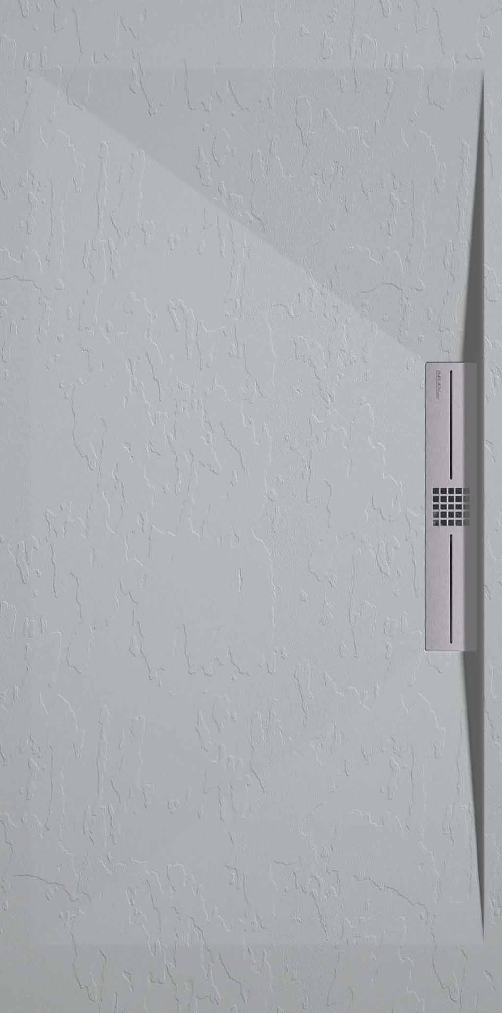 Plato de ducha carga mineral STONE SIDE con pendiente centrada y rejilla rectangular.
